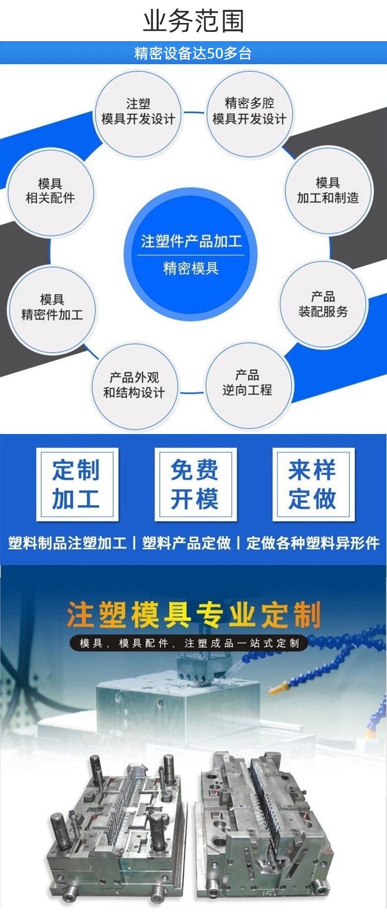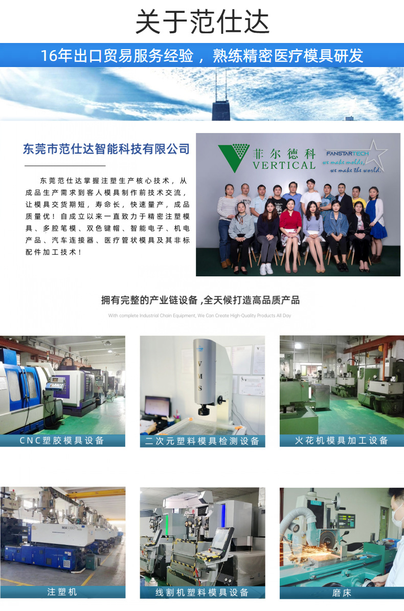主要加工设备:钻孔机、CNC、慢走丝、磨床、火花机(普通/镜面)、省模、组模、注塑机