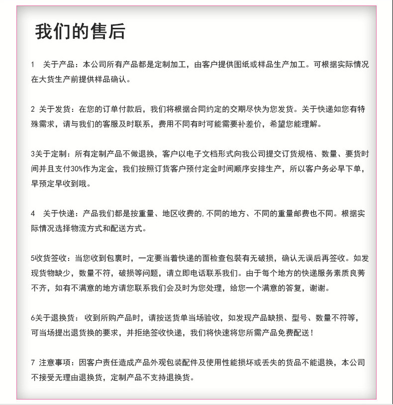 本司产品规格繁多, 所标样品图及价格仅供参考,如需定做请先告知加工所用材料名称,定做数量,产品图纸,工艺要求。在未协商好合作价前请勿随意拍下商品,谢谢您的理解与支持。