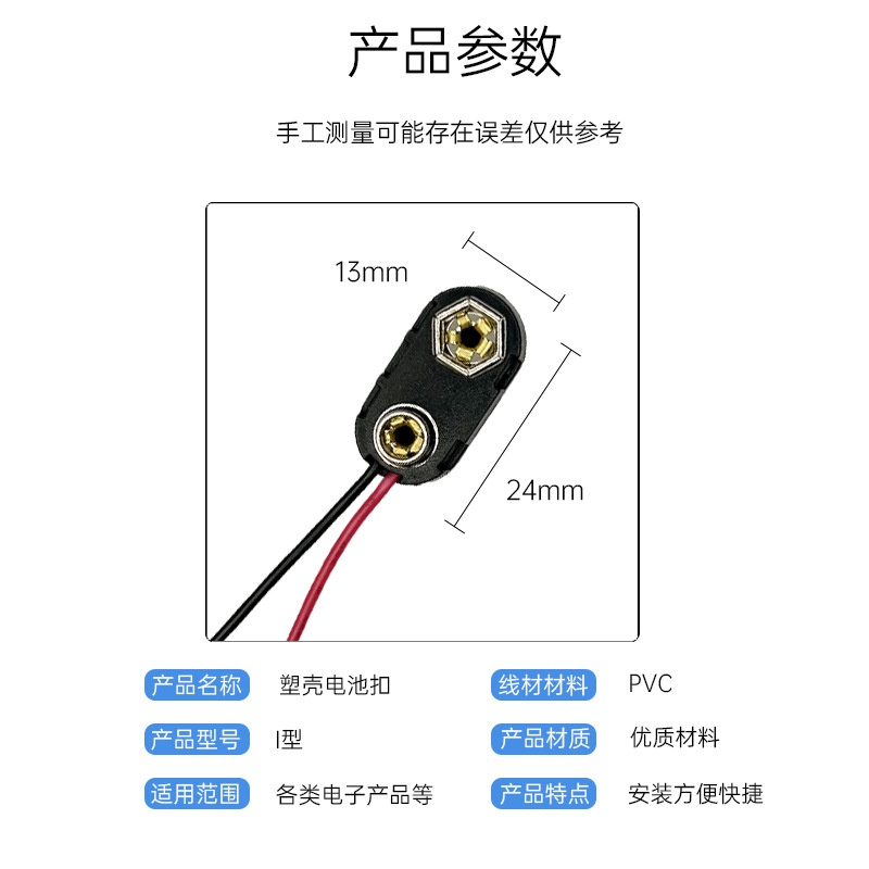 商品名称:T型硬扣9v电池扣 音频线接万用仪表仪器电池连接器塑胶9v电池线夹