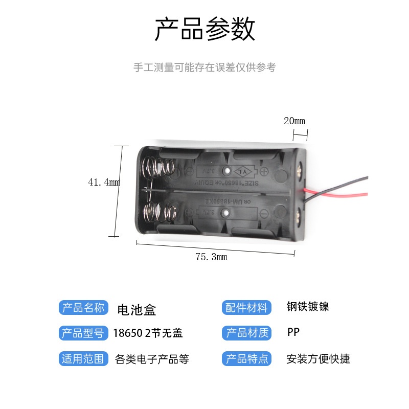商品名称:18650两2节并联无盖PP料电池盒座仓 3.7V输出并联电池盒