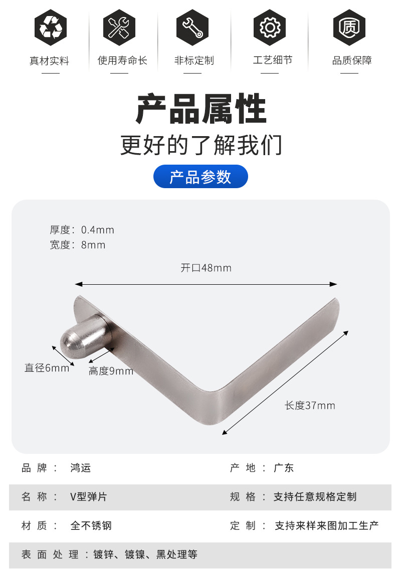 商品名称:不锈钢V型弹簧片实心旗杆拖把刮刮乐管内五金定位卡扣6x9x37