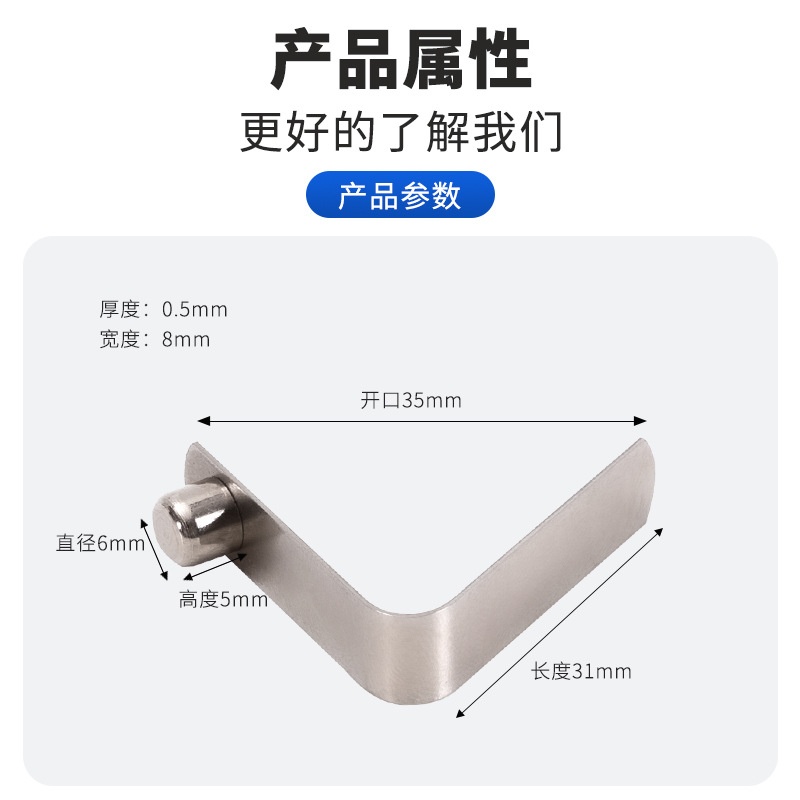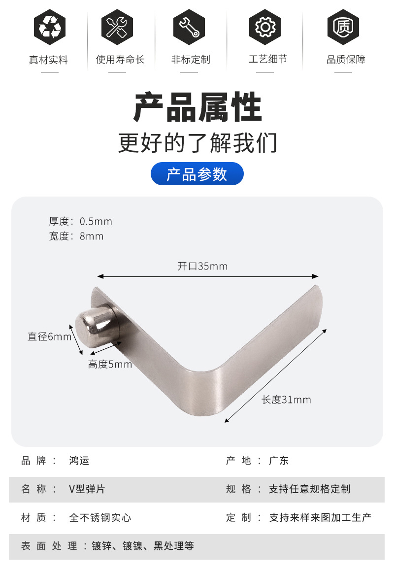 商品名称:不锈钢锰钢镀镍镀锌弹片单头实心拐杖专用V型弹簧片 6x5x31mm